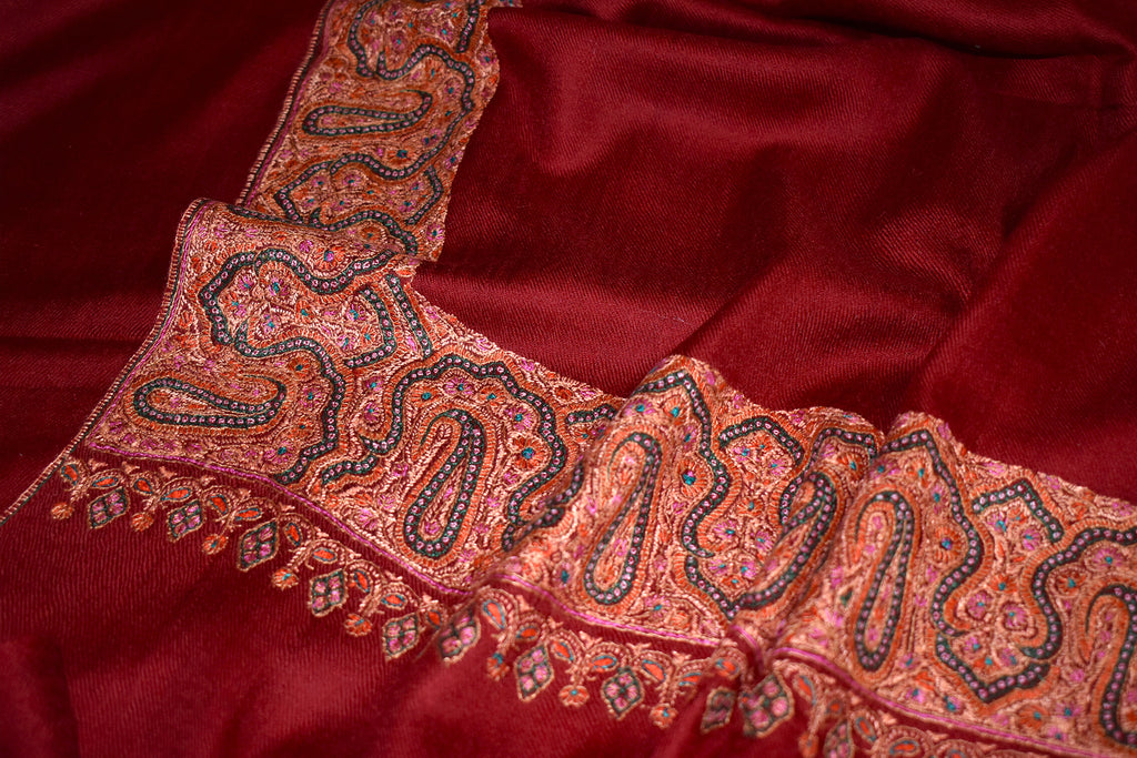 This Shawl is hand embroidered here in the beautiful Kashmir Valley. We use a tiny needle for embroidery to make sure we have fine stitches. Hand embroidery is both men’s and women’s job and we are proud to have some very talented craftswomen associated with us. A shawl takes months to years to get ready, depends on the intricacy of the pattern.